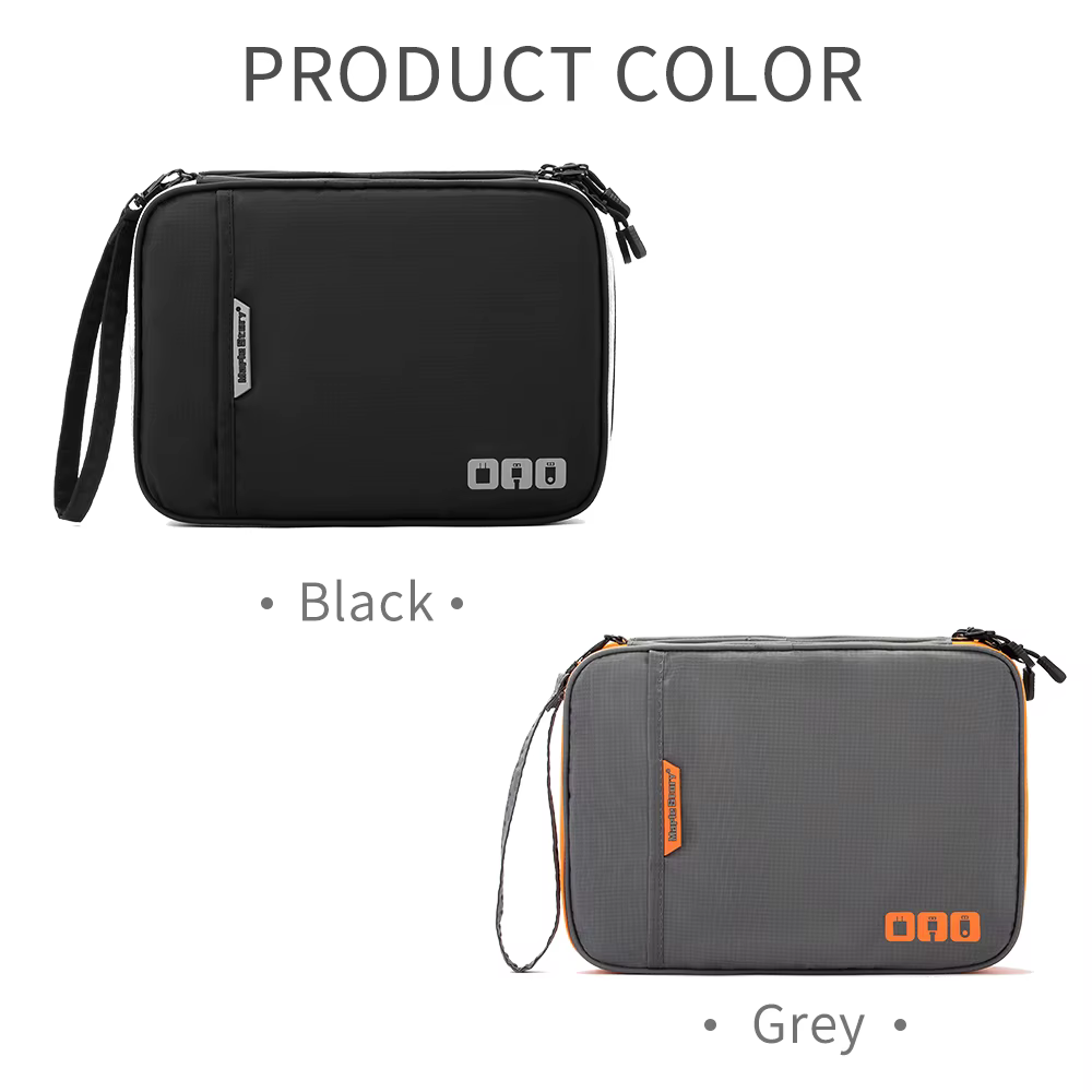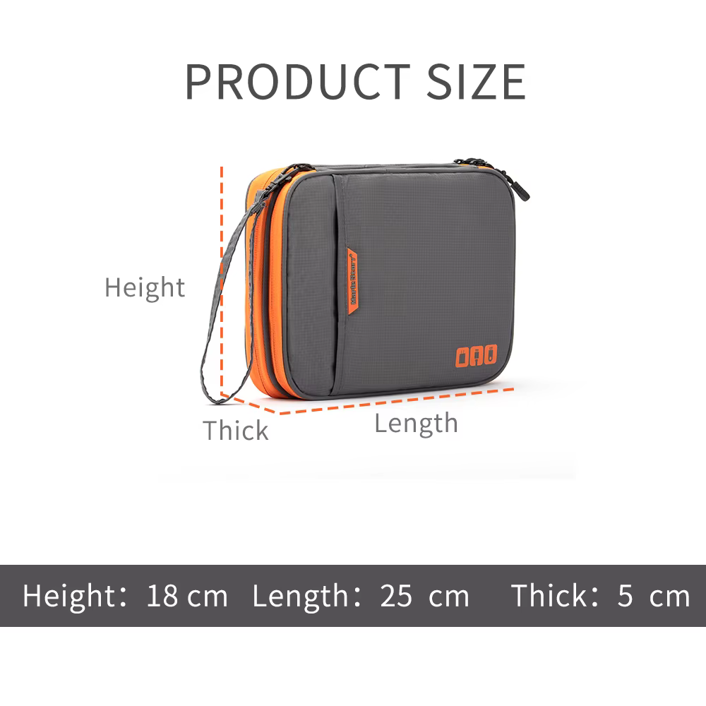This Cable Storage Bag is designed to organize electronic accessories and cords efficiently, featuring padded durable water-repellent nylon for protection against scratches, dust, and drops. Its double-layer design includes elastic bands and mesh pockets for cables, chargers, earphones, and more, while a bigger zipper mesh pocket fits an iPad mini or similar devices. Lightweight and portable, it’s perfect for travel, daily use, or gifting. The stylish simplicity design adds functionality while remaining slim and easy to carry.